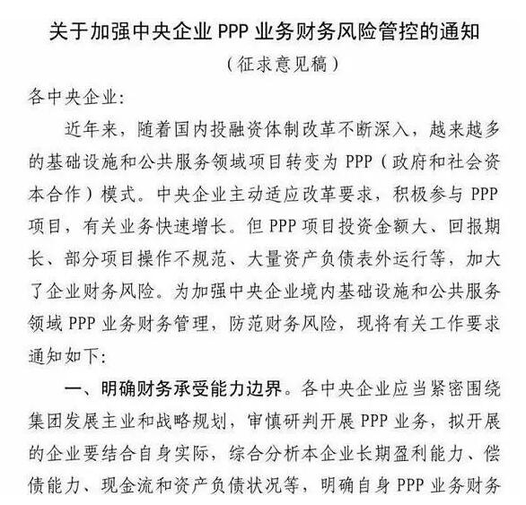 最近一份国资委办公厅下发《关于加强中央企业PPP业务财务风险管控的通知》(征求意见稿)在圈内流传,该通知明确提到央企要审慎开展PPP业务,明确自身 PPP 业务财务承受能力的上限,对PPP业务实行总量控制。