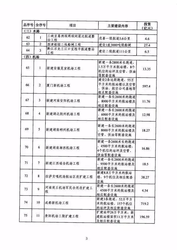 公路方面,投资重点集中在高速公路,未来3年重点推进项目27、14、13个,涉及总投资2449亿、1309亿、2000亿元。机场方面,未来3年重点推进项目16、12、22 个,涉及总投资1745亿、1198亿、1664亿元。水路方面,未来3年重点推进项目3、4、3个,涉及总投资39亿、53亿、54亿元。