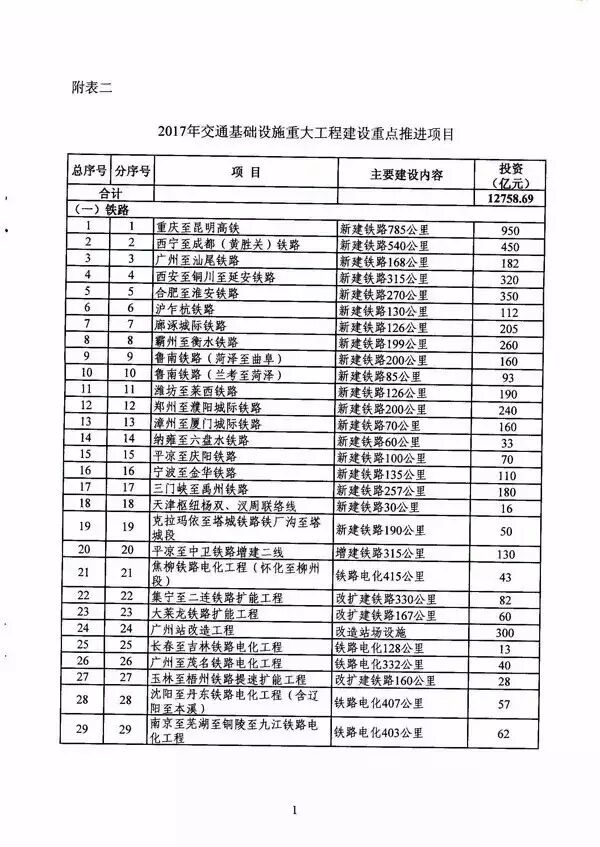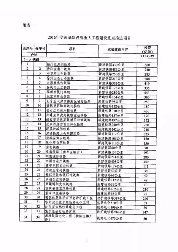 铁路方面,投资重点集中在高铁、中西部铁路和城际铁路上,2016年重点推进项目34个,涉及总投资7803亿元,其中31个项目包含在中国铁路总公司2016年计划新开工的45 个项目中(总投资8300 亿元);2017、2018年重点推进项目29、23个,涉及总投资4946亿、6994亿元。