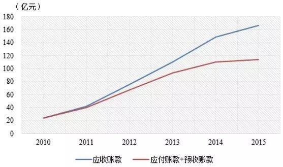 金螳螂应收账款较多,占主营业务收入、总资产的比例较高的原因主要是基于建筑装饰行业特点和收入确认方法(金螳螂和其他装饰类上市公司的年报中有介绍)。在百度百科“朱兴良”的介绍中,我们看到了这样一句话:“支付难”一直都是装饰行业的普遍问题,身处上下游之间的金螳螂,这几年应收账款和应付账款的金额也基本接近。然而,我们看近2年金螳螂的应收账款、应付账款、预收账款数据,发现应收账款与应付账款+预收账款数据之间的差距越来越大,据2015年年报,金螳螂应收账款166亿元,应付账款+预收账款114亿元,虽然金螳螂不需要完全垫资,大部分还是占用上游供应商的资金,但我们也看到,金螳螂需要垫付的资金缺口也越来越大(图3),甚至在2015年年中爆出“金螳螂资金链断裂欠债不还”的新闻,可见,未来像金螳螂这类装饰企业,面临的应收账款管理的压力仍然很大。