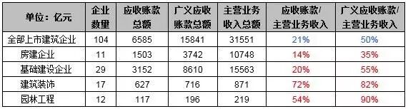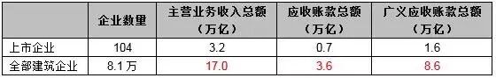 按上市企业主营业务收入占全部建筑企业主营业务收入比例的18.6%来估算(上市企业应收账款总额占全部建筑企业应收账款总额的比重、上市企业广义应收账款总额占全部建筑企业广义应收账款总额的比重均按18.6%来估算),建筑业应收账款总额约3.6万亿,广义应收账款总额约8.6万亿。