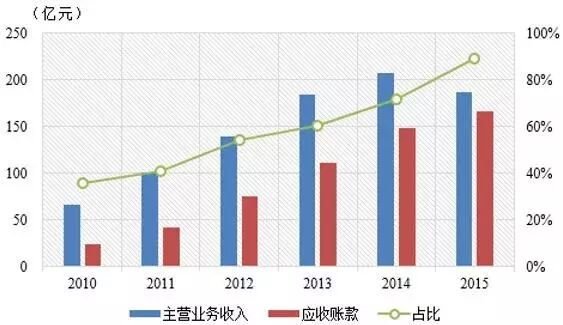 从上市公司年报的数据,我们可以看到,装饰企业应收账款的特征之一就是其他应收款金额很小、存货中已完工未结算的数据未加统计,因此广义应收账款的数据与应收账款的数据基本一致。金螳螂是建筑装饰类上市企业中,除洪涛股份、亚厦股份外,应收账款占主营业务收入比重接近100%的典型企业之一。2010-2015年金螳螂应收账款连年增长,复合增长率高达48%,应收账款占主营业务收入的比重也不断增加,从2010年的36%增长到2015年的89%(图2),增长极其快速。