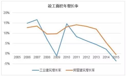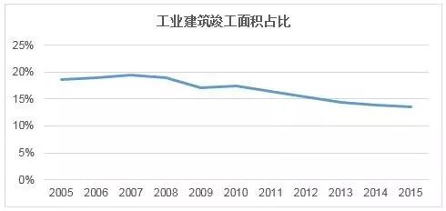 曾经,工业建筑竣工面积占房屋建筑市场的比例接近20%,2007年最高峰时达到了19.5%,其后这一占比连年降低,尤其是2010年之后,降低的速度明显加快,到2015年达到13.5%。究其原因,2000-2010年的10年,是中国建筑业高速发展的黄金10年,建筑业总产值的年均增速超过20%,行业规模的急速扩张,在短短的几年内就让工业行业所需的建筑物达到几近饱和的状态,在2007年达到高峰。
