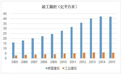 2005-2015年,我国房屋建筑竣工面积总计达到321亿平方米,其中工业建筑总计达到52亿平方米。