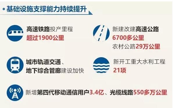 “——基础设施支撑能力持续提升。高速铁路投产里程超过1900公里,新建改建高速公路6700多公里、农村公路29万公里。城市轨道交通、地下综合管廊建设加快。新开工重大水利工程21项。新增第四代移动通信用户3.4亿、光缆线路550多万公里。”